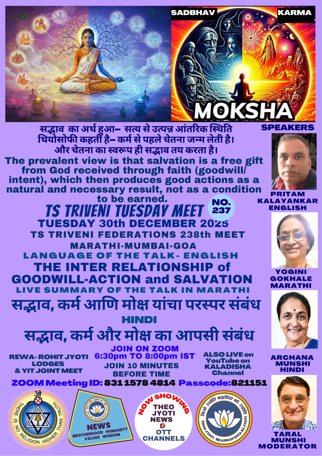 TOMORROW-on 30th DECEMBER, TUESDAY- JOIN ON ZOOM AT 6:30 PM. TO KNOW ABOUT: SADBHAV- KARMA & MOKSHA